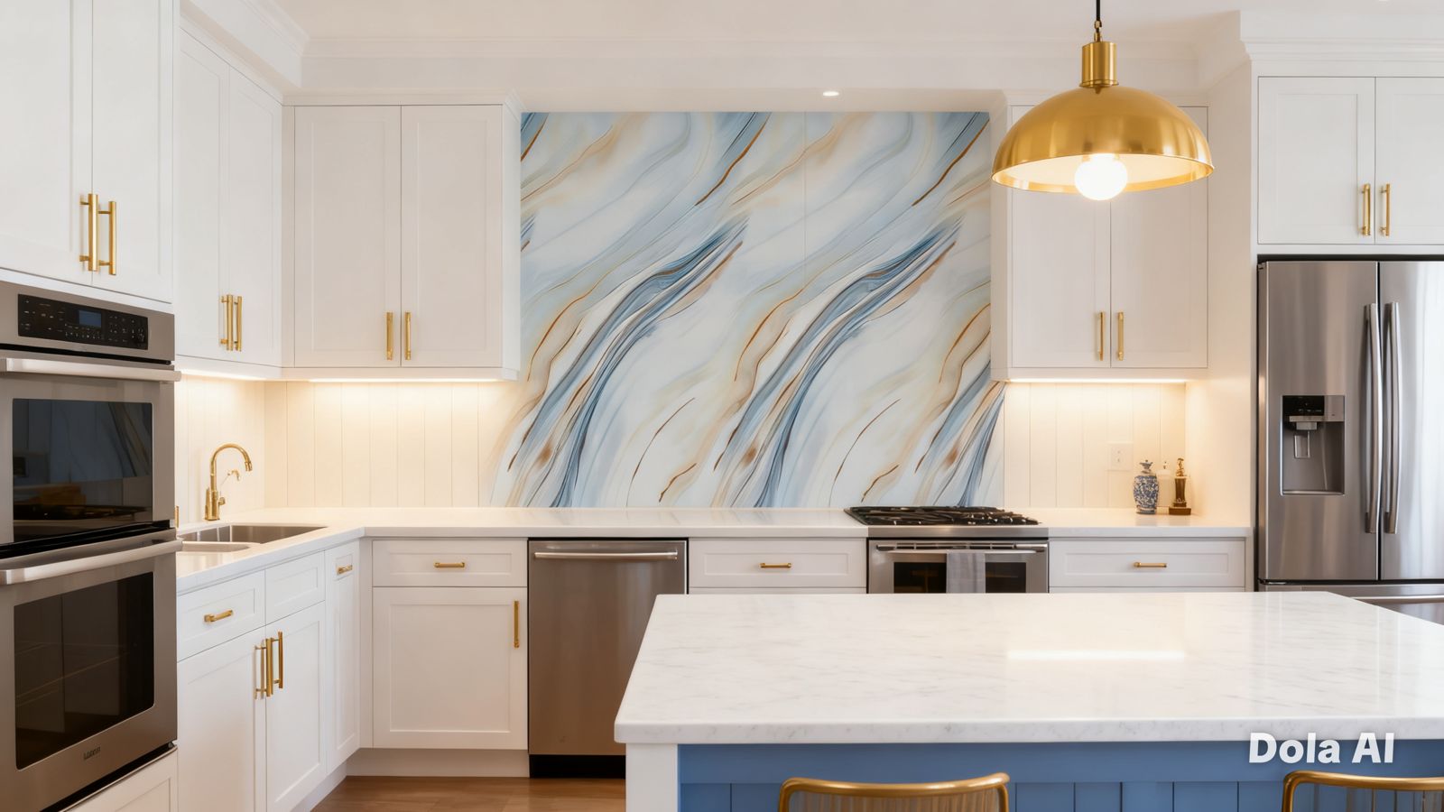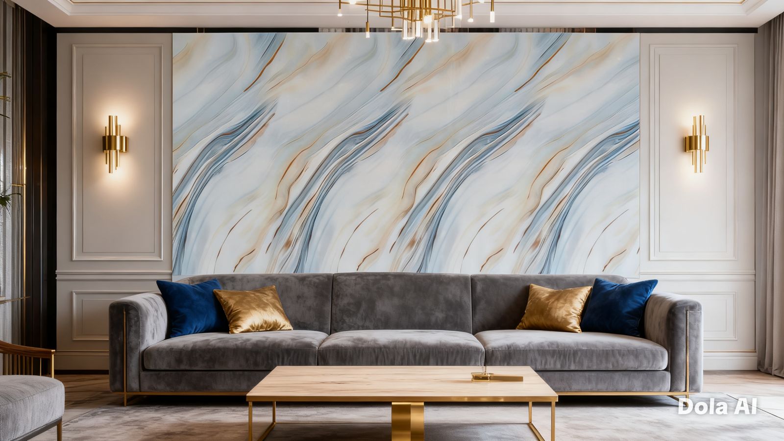 El modelo Blue Ivory Flow presenta una base clara en tonos marfil y blanco suave, acompañada de vetas fluidas en azul grisáceo y toques cálidos, creando un diseño abstracto de apariencia ligera, elegante y muy armoniosa.